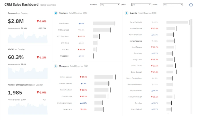 Quarter over quarter performance dashboard, focusing on the managers, agents and products sales. Different filters are available and they are based on customer information like office or sector.