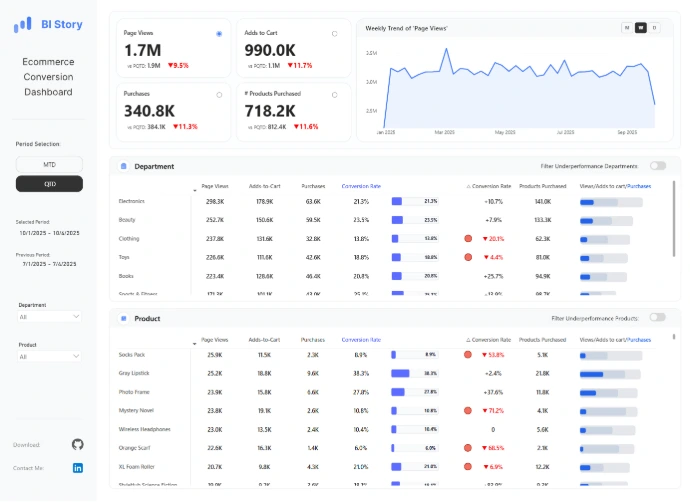This dashboard analyzes the ecommerce conversion funnel from Page Views to Adds to Cart to Purchases.