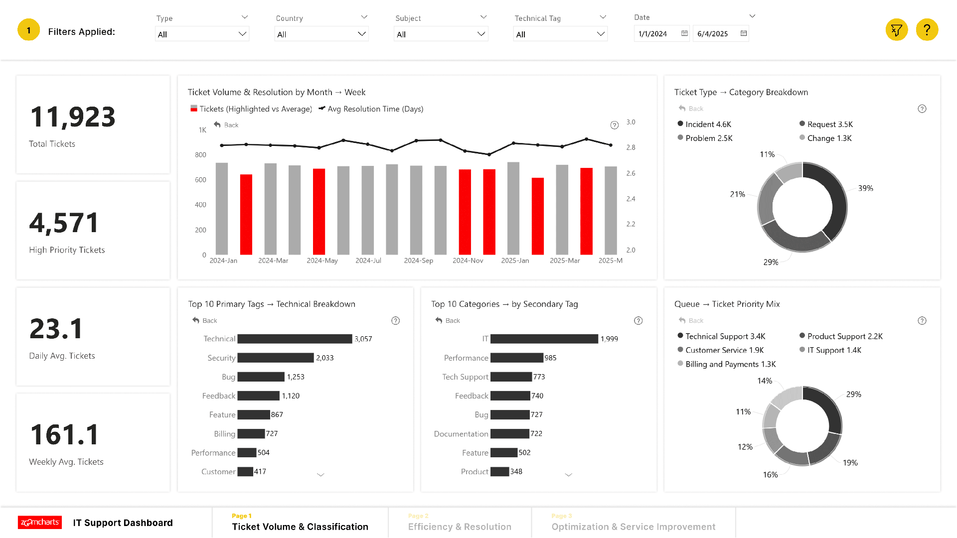 A structured analysis of IT support operations across three key focus areas: 1. Ticket Volume & Classification 2. Efficiency & Resolution 3. Optimization & Service Improvement