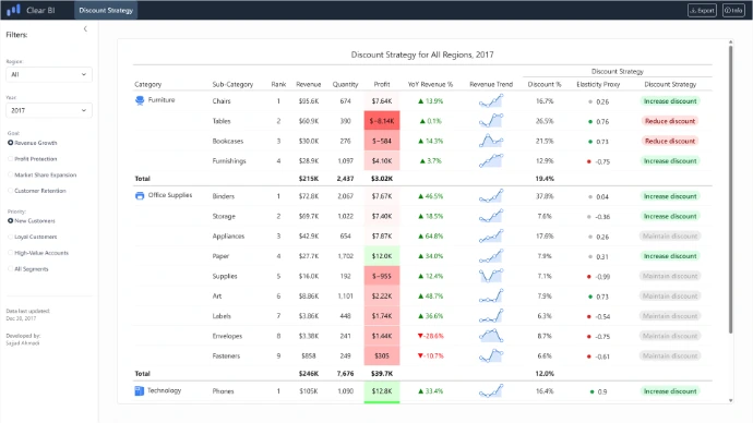 A business intelligence dashboard built with Quarto and Shiny for Python that provides data-driven discount strategy recommendations through analysis of price elasticity, customer segments, regional performance, company goals and historical trends.