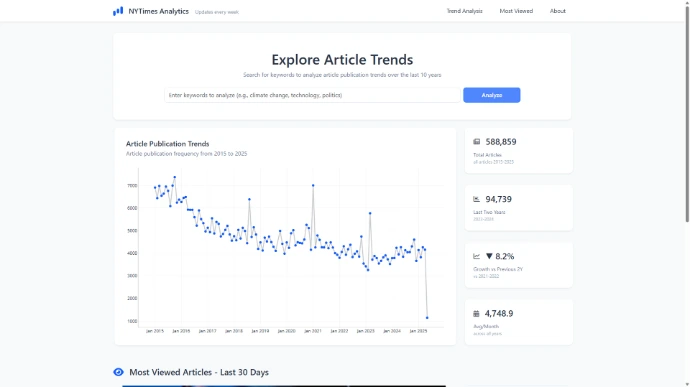 Interactive dashboard analyzing 15 years of New York Times articles (2010-2025). Built with Dash and Bootstrap.
