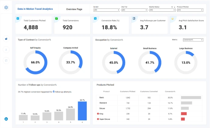 Data in Motion Travel Analytics, This dashboard provides a comprehensive view of customer conversion performance, and It helps identify the characteristics of customers most likely to convert.