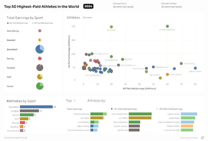 I designed this dashboard to better understand the distribution of the highestpaid athletes across different sports, and how much they earn both on the field and off the field.