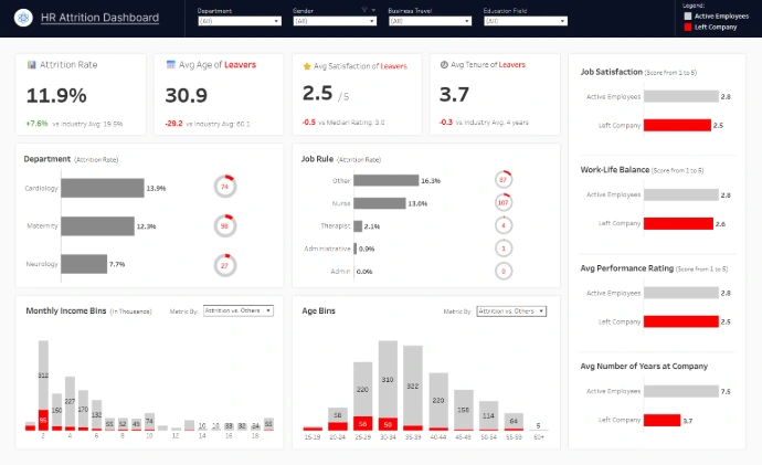 Tableau HR Attrition Dashboard showing employee attrition rate, average age, satisfaction, and tenure of employees who left, compared with active employees.